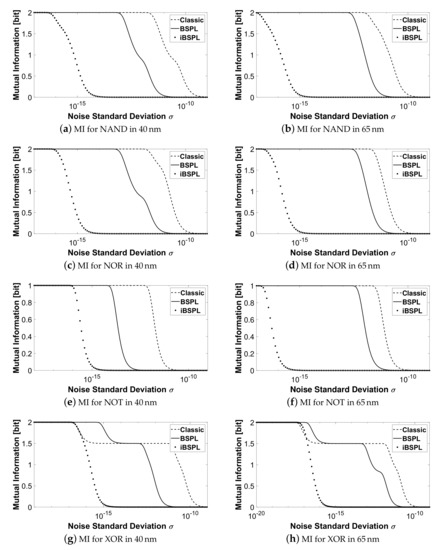 As a next step we analyze how much information can be extracted from the leakage of each of the balanced and unbalanced gates. In the simulation environment, the (static) power measurements are free of noise. Hence, even extremely small differences between the power consumption associated with the processing of different data values lead to successful key recovery. Therefore, the goal of a proper security evaluation in the simulation domain is to put the feasibility of attacks on the underlying circuit in relation to the noise level. In reality, the power measurements are always affected by noise originating from the measurement setup and environmental parameters. To this end, an evaluation metric based on the concept of Information Theory has been developed in [31]. It considers Gaussian-distributed noise centered to the simulated power values, and estimates the mutual information between the simulated leakage and the processed data. For a given noise standard deviation, the technique evaluates the amount of available information which can be exploited by the worst-case adversary, independent of the type of relationship between leakage and processed data (e.g., specific leakage models, linear/non-linear dependency, ...). Therefore, the purpose of IT analysis is to extract a curve of the mutual information over the noise standard deviation, therefore identifying the necessary noise level to fully hide the information leakage. The lower the required noise, the higher is the robustness, since the leakage can more easily (with lower noise) be hidden. Such a security evaluation has been used to assess the robustness of DPA-resistant logic styles in [32]. We have conducted this type of analysis on our new logic gates and compare them to BSPL and classic logic. The result is shown in Figure 9 and Figure 10 for all gates in both 40 nm and 65 nm technology. To compare the results, it is important to observe which mutual information curve drops at a lower amount of noise, identifying the more robust countermeasure [31,32]. It is obvious that the iBSPL gates require the least amount of noise to hide the data dependency which indicates the highest protection against attacks.