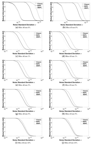 Although in the dynamic area, load capacitances dominate the current consumption and consequently information leakage, in the case of static leakage, the leakage current is dominated by subthreshold, and gate leakages, which are also a function of various parameters such as threshold voltage, oxide thickness, transistors dimensions, supply voltage [33,34,35]. Naturally, process variations and layout imbalances affect any equalization countermeasures. Furthermore, layout and RC-extraction through the post-layout analysis improve the accuracy of simulations [36,37]. Ignoring such post-layout and post-production can mitigate the leakages. However, the mitigation level is undoubtedly reduced in reality (post-production), and the benefit of the countermeasure will not entirely vanish. Hence, here we just consider the impact of process variations on the ability of a worst-case (i.e., strongest possible) adversary to extract information. In this regard we have used Monte Carlo simulations to model intra-die process variations of severity levels of 1%, 3%, 5% and 10%. For every SBox circuit and every possible input value, we carried out 500 Monte Carlo simulations, performed the information theoretic analysis for a noise standard deviation , and took the maximum mutual information value as the representative value for the given noise level. Although the margin between iBSPL and BSPL/Classic is clearly reduced when process variations are considered, our newly developed logic cells still provide the highest level of protection against information extraction across all levels of process variations. Table 6 compares the energy (static and dynamic) and latency overhead associated with the BSPL and iBSPL versions of the PRESENT SBox. Clearly, iBSPL does not only provide the better protection, it also comes at a lower overhead in terms of energy and latency.