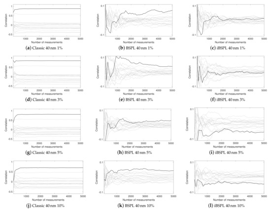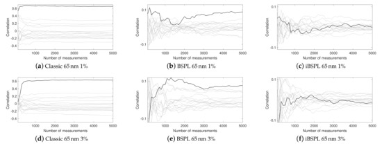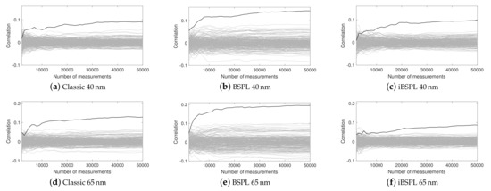 As a final comparison between classic logic, BSPL and iBSPL we consider static power and dynamic power analysis attacks on the synthesized SBox circuits. For that purpose, we have simulated the leakage current of each SBox circuit 5000 times for random inputs while adding Gaussian-distributed noise. In fact, we have repeated that process 500 times to model the influence of process variations corresponding to the given severity level. As an attack strategy we have chosen Moments-Correlating DPA (MCDPA) [38], since this analysis technique does not depend on the choice of a particular leakage model and therefore allows a fair comparison. Please note that the same attack has also been successfully applied to experimental static power side-channel measurements in [12]. Our results are shown in Figure 11 for 40 nm technology and Figure 12 for 65 nm technology. To exclude any influences of the probabilistic nature of additional noise to the traces we have used exactly the same noise distribution for classic logic, BSPL and iBSPL. Although it is clearly more difficult to recover the key difference in the case of the BSPL circuit compared to regular logic cells, the SBoxes synthesized with iBSPL cells again provide the highest level of protection in this analysis. In fact, most of the attacks are not able to isolate the correct key difference (black) from the incorrect ones (grey) using the available number of traces.