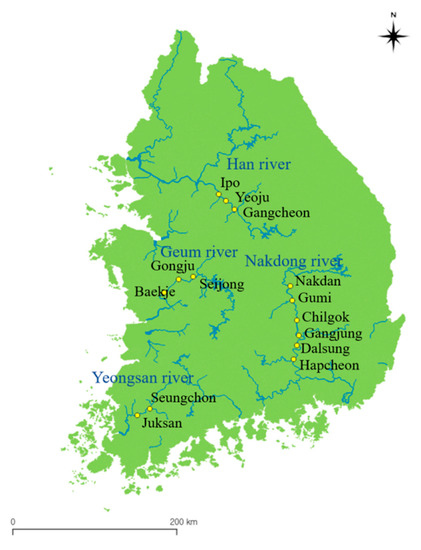 The Han, Nakdong, Geum, and Yeongsan rivers are the four major rivers in Korea. During the period of 2010–2011, a large river restoration project was implemented to control flooding and water supply due to climate change in the Korean peninsula. The Korean peninsula is located in the monsoon region of northeast Asia, which is characterized by heavy rainfall in the summers and long drought periods in the winters; it is classified as an extreme-risk area in terms of the climate change vulnerability index [9,14]. The project included expansion of the river channel capacity and the construction of multipurpose weirs, which involved the dredging of large amounts of benthic sediment and riverside floodplains. As the weirs began operation in 2013 to maintain the designated water levels, the rivers upstream from the weirs were expected to be river–reservoir systems. Sediment samples were collected 0.5–1.0 km upstream from each weir, as shown in Figure 1 (http://water.nier.go.kr, accessed on 31 May 2019). The collected sediments were primarily built up after the construction of the weirs because the original river sediments were dredged during the restoration project.