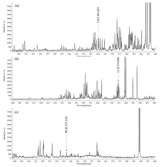 Main emission lines of the target elements (Cd, Cr, Pb) in the LIBS spectra of the sediment samples.