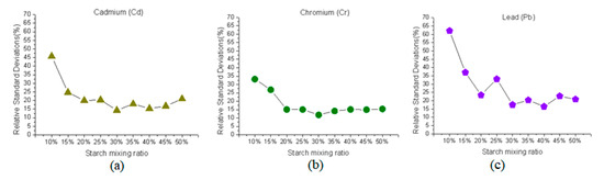 RSD results with an increasing starch-mixing ratio: (a) Cd at 361.051 nm, (b) Cr at 274.898 nm, and (c) Pb at 537.210 nm.