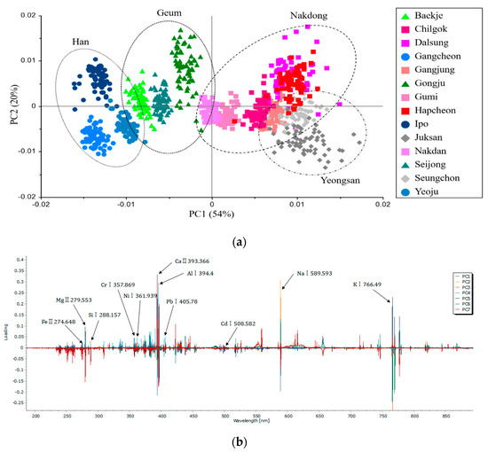 Score (a) and loading (b) plots of first two PCs from the PCA on the LIBS spectra at the selected lines of sediment samples.
