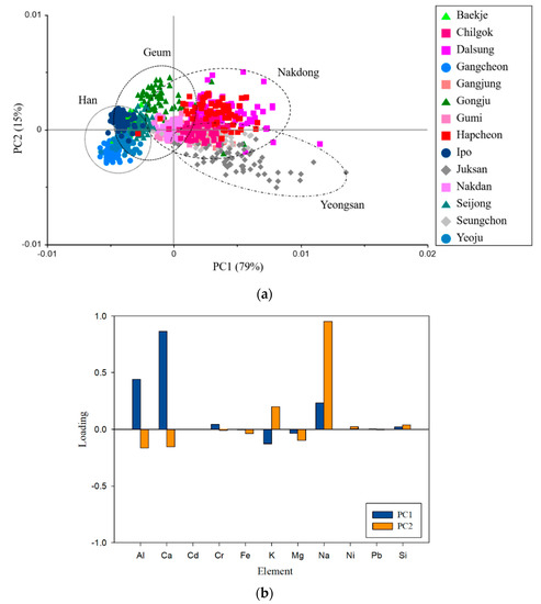 Figure 5b shows the loading plot of the PCA, which indicated the importance of the analyzed variables. The data show that Al, Ca, and Na provided the dominant contributions to PC-1 and PC-2. To completely explain the scattering of the score plot, the loading coefficient, which is shown in Figure 5b, was utilized to analyze the scattering distribution of the four types of sediments. The Nakdong and Yeongsan classes, which had relatively high concentrations of Al and Ca, were located on the positive side of PC-1, and the Han and Geum classes, which had relatively low concentrations of Al and Ca, were located on the negative side of PC-1. In addition, the classes of Nakdong and Geum, which contained relatively high concentrations of Na, were distributed on the positive side of PC-2, and the classes of Han and Yeongsan, which had relatively low concentrations of Na, were scattered on the negative side of PC-2.