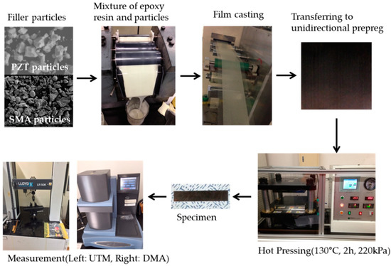 In the research so far, there have been many studies to improve the vibration damping of composite materials by using PZT particles or SMA particles alone. Of course, there have also been attempts to apply PZT and SMA to composite materials at the same time. Dong et al. fabricated the thin SMA film deposited on PZT substrate composite by sputtering for enhancing damping property [22]. However, devices fabricated in this way are very expensive and difficult to apply to large-area composite materials. In this study, PZT and SMA particles were applied separately to composite laminates to evaluate the vibration damping efficiency. In order to observe the effect of particle mixing, both PZT and SMA particles were mixed and applied to composite laminates to evaluate the effect. Particles are dispersed in large area films, so it is easy to apply to a large area and can be manufactured relatively inexpensively. The loss factor (tan δ) was used as a parameter to indicate the vibration damping capability, measured using a dynamic mechanical analyzer (DMA). The change in vibration damping as a function of the particles loading was observed. In addition, flexural moduli of the interleaved specimens were evaluated to investigate the effect of the interleaved layers on the mechanical performance.