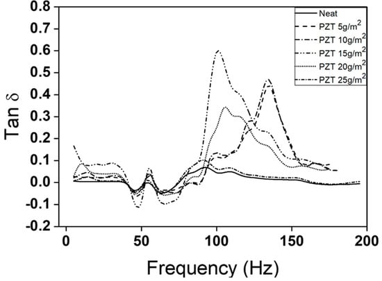 Figure 4 shows the measured loss factors of the specimens interleaved with PZT-particle-dispersed mixture films as functions of frequency. As stated earlier, the amount of dispersed PZT particles in the mixture film was varied from 0 g / m 2 to 25 g / m 2 with an increment of 5 g / m 2 . The specimen denoted as “neat” was not interleaved with mixture films and served as a reference. As can be seen from Figure 4, in general, the measured loss factor increases with the particle loading. For the PZT interleaved specimens, the frequency range where the loss factor increases most is approximately between 100 Hz and 150 Hz. The maximum loss factor peak was observed at 15 g / m 2 loading, and an improvement in loss factor can be observed up to 20 g / m 2 loading. In the case of 25 g / m 2 , the loss factor shows almost no enhancement over neat specimens. It is presumed that, in the case of 25 g / m 2 loading film, the particle content was too high to make a film in which particles were uniformly dispersed.