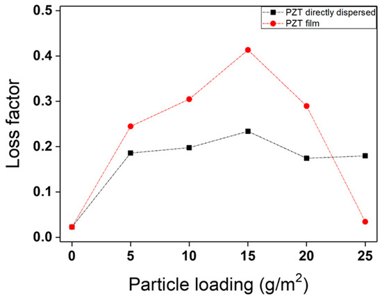 Figure 5 shows the loss factors of the CFRP samples with PZT particles directly dispersed with between the composite plies at 120 Hz frequency. In previous research, a study was conducted through a specimen of composite materials in which PZT particles were directly dispersed. Existing results show that loss factor values are maximized at 120 Hz for specimens with direct distribution of PZT particles [25]. In this study, it was confirmed that the loss factor for different particle loadings was maximized in the range between 100 Hz and 150 Hz in a specimen using film-dispersed particles. However, in order to confirm the effect of particle dispersion on the loss factor through film dispersed particles, 120 Hz, which can confirm the most maximized effect by directly spraying particles, was compared. In the case of film-interleaved specimens with particle contents of 5 g / m 2 to 20 g / m 2 , the loss factor values are higher than those of directly dispersed specimens by up to two times or more. For the directly dispersed specimens, the improvement in the loss factors was observed up to the particle loading value of 15 g / m 2 . For higher particle loadings, the loss factor decreased due to poor dispersion of particles. On the other hand, when the mixture film was used, an improvement in the loss factor could be observed up to 20 g / m 2 . The method of using the mixture film rather than the direct application therefore can provide an improved damping capability through a better dispersion of particles. Kim et al. insisted that when using PZT particles dispersed by hand, it was revealed that the optimal content exists according to particle dispersion, and through this, the importance of particle dispersion was confirmed [8].