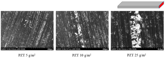 In order to confirm the improvement in particle dispersion by the use of the film, the cross-section of the specimen was further investigated using EPMA. Lead (Pb) contained in the PZT particles was traced and mapped using the EPMA. As shown in Figure 6, good particle dispersion was confirmed. However, with the increase of the particle concentration, aggregations of the particles are formed, and the quality of dispersion deteriorates. Therefore, as described above, it is speculated that the cause of the decrease in loss factor for the particles loading at 25 g / m 2 is the deterioration in dispersion of particles in the film. SEM images of the cross-sections of the specimens are shown in Figure 7, which clearly shows aggregations and thus confirms that high particle concentration may be detrimental to the dispersion of particles.