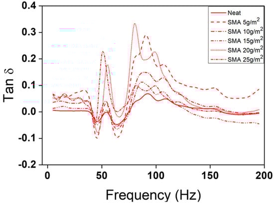 The DMA results of the carbon fiber composite material including mixed PZT and SMA-particle-dispersed mixture film (PZT + SMA) are shown in Figure 9. The partial content of each kind of particles in the mixture film is 10 g / m 2 each to make the total particle content of the film 20 g / m 2 . In the figure, the loss factor values of PZT + SMA dispersed specimens are compared with those of PZT dispersed and SMA dispersed specimens. As mentioned above, the loss factor values of PZT + SMA dispersed specimens were measured to be larger than the loss factor of neat specimens in the whole frequency range.