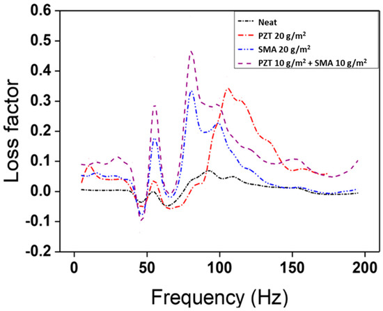 It is interesting to note that the loss factor values of PZT + SMA dispersed specimens are higher than the specimens with SMA particles only in the whole frequency range. This is in contrast to the behavior of specimens with PZT particles; at 100–120 Hz, the PZT + SMA specimen had a lower loss factor value than the PZT particles specimen. Hartl et al. [26] showed that it is necessary for SMA to reach a temperature condition that can cause phase change inside the material in order to exhibit pseudoelasticity. It was also shown that the higher the temperature, the greater the energy consumed by deformation. Therefore, in SMA, the higher the temperature is, the faster the vibration energy can be dissipated. The thermal energy generated from the deformation of the PZT accelerates the phase change of the SMA when the piezoelectric material and the shape memory alloy are used simultaneously.