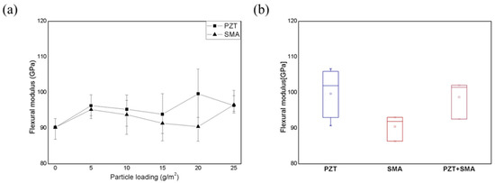 Figure 10. Flexural modulus of the CFRP specimens with (a) PZT- and SMA-particle-dispersed mixture films for different particle loadings and (b) PZT-, SMA-, and PZT 10 g/m2 loading/SMA 10 g/m2 loading mixed-particle-dispersed mixture films.