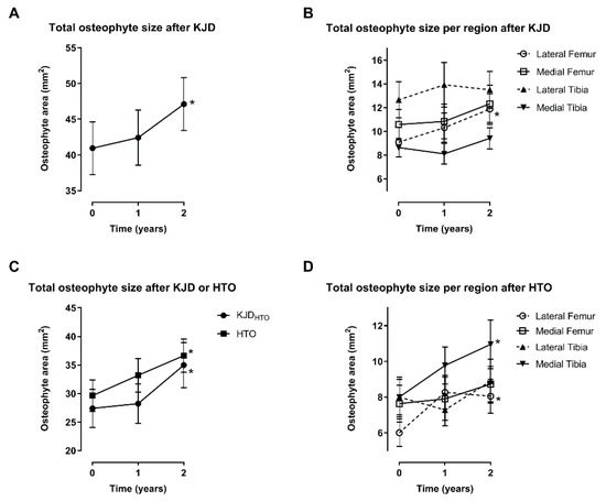 Change in osteophyte size in mm2 before and one and two years after treatment with knee joint distraction (KJD, n = 58) or high tibial osteotomy (HTO, n = 36). (A) The total joint osteophyte area and (B) the osteophyte area per compartment after KJD. (C) Total joint osteophyte area after KJD or HTO and (D) osteophyte area per compartment after HTO. Mean and standard error of the mean (SEM) are shown, * indicates significant changes compared to baseline using repeated measures ANOVA (p < 0.05).
