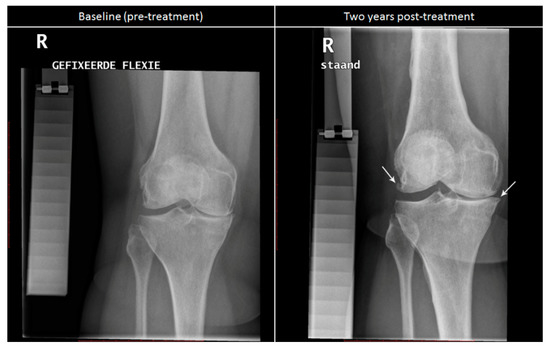 A representative radiograph of a patient before and 2 years after KJD treatment is shown in Figure 2, here showing an increased osteophyte size on the lateral femur and medial tibia over 2 years.