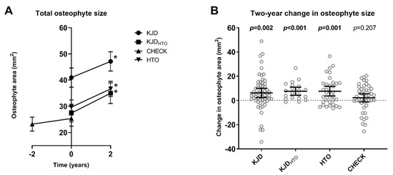 Before TKA, CHECK knees showed a small nonsignificant increase in osteophyte size (+2.1 mm2; 95%CI −1.2–5.5; p = 0.207; Figure 3A). Correcting for baseline osteophyte size, all KJD patients together (p = 0.027), KJDHTO patients (p = 0.043), and HTO patients (p = 0.027) showed a significantly greater osteophyte increase than CHECK patients prior to TKA. Taking the average of both knees in patients with a TKA in both knees, instead of using the knees separately, did not change significance. Figure 3B displays the 2-year changes in total osteophyte size for the different groups.