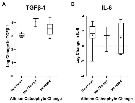 None of the four osteophyte locations showed statistically significant 1-year changes in Altman score compared to baseline in the SF patients (all p > 0.074; Supplementary Table S4). The total Altman osteophyte score summarized for the entire joint was at 1 year not different from baseline, increasing with 0.2 points (95%CI −0.6–0.9; p = 0.653). As the biomarker changes were not normally distributed, they were log transformed. In case of negative change values, the log transformation of the absolute change was subtracted from zero. Two patients did not have biomarker results after treatment, and one did not have a baseline value for TGFβ-1, leaving fourteen patients for TGFβ-1 analysis and fifteen for IL-6 analysis. Both biomarkers showed statistically significant changes during the distraction period, as shown previously [25]: TGFβ-1 (1527.9 ± 3346.8 to 8027.9 ± 10,534.8 pg/mL; p < 0.001); IL-6 (24.4 ± 31.3 to 466.3 ± 936.4 pg/mL; p = 0.011). There was no apparent association between baseline values of these biomarkers and the baseline total Altman osteophyte score, or between the changes in these parameters (all p ≥ 0.28; Supplementary Table S5). Trichotomization of patients in groups with a decrease (n = 5), no change (n = 3), or increase (n = 6 for TGFβ-1; n = 7 for IL-6) in total Altman osteophyte score showed there was a statistically significant difference in changes in analyte levels during treatment between the three groups for TGFβ-1 (p = 0.044), but not for IL-6 (p = 0.898), as shown in Figure 4.
