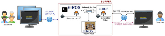 This study is based on the SimUlation Framework for Education in Robotics (SUFFER). It was designed and developed to promote the robotic field remotely. The idea is to simplify the deployment process and to facilitate a system where the teachers can simulate robots and supervise students. Figure 1 illustrate the design and the interaction with students and Teachers. The initiative proposes to deploy virtual desktops, disposing of a robot middleware such as ROS (Robot Operating System) or YARP (Yet Another Robot Platform), simulation tools, and a set of datasets obtained by real sensors. The aim is to focus on the course and the content involved, avoiding some of the tedious tasks of system configuration to the student.
