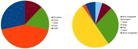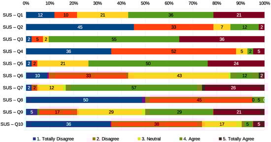 The calculation is determined by each item’s score contribution ranging from zero to four following the classic approach. It is necessary to count those positively-worded items enumerated by 1, 3, 5, 7, and 9. The score contribution of these items is defined by the scale value minus 1. Those items considered negatively worded (2, 4, 6, 8, and 10) define the score subtracting 5 to the scale position. Finally, the overall SUS score is obtained by multiplying the sum of the item score contribution by 2.5 and as a result, we get the scores to range from 0 to 100. This scale reflects higher satisfaction from the user with higher values. General SUS interpretation shows [40] the next adjectives for the scale: Excellent [>80.3]; Good [68–80.3], Okay [68], Poor [51–68], and Awful [<51]. Updated approaches recognized more adjectives [41] Best Imaginable [>90.9], Excelent [90.9–85.5], Good [85.5–71.4], Okay [71.4–50.9], Poor [50.9–35.7], and Awful [35.7–20.3], Worst Imaginable [<20.3]. Figure 5 illustrates graphically the results of our questionnaire associated with each researcher study.