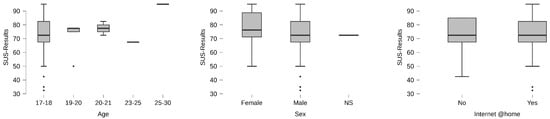 Finally, it is explored the SUS attending the age, gender, and Internet Connection availability. Figure 6 shows the boxplot for the different age groups present a Good result for all ages except for 23–25 and 25, the former within the group of okay and the latter within the group of Excellent. Center of Figure 6 presents the boxplot by Gender and the right diagram by the Internet connection. The reported SUS results by sex find slightly better perception than Male or not said cases; however, classifications bounded them in the same window Good. It analyzes the answers delivered by those with no Internet at home. It presents a lower ratio (under%1) than those with the Internet at home. However, it is important to say that this small percent is key when using Bangor scale [41] because it means that it goes from Good to Okay.
