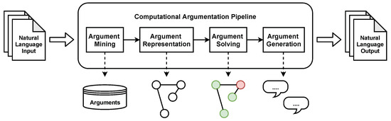 Argumentation is the process by which humans reason to support an idea, an action or a decision. During this process, arguments are used by humans to shape their reasoning using natural language. In an attempt to understand how human reasoning really works, researchers have focused on analysing and modelling the use of arguments in argumentation. This problem has been usually approached by philosophers and linguists [1,2,3]. However, recent advances in Artificial Intelligence (AI) show promising results in Natural Language Processing (NLP) tasks that were previously unfeasible (e.g., machine translation, text summarisation, natural language generation), but now leave the door open to exploring more complex aspects of human language and reasoning. Computational argumentation is the area of AI that aims to model the complete human argumentative process [4,5], and encompasses different independent tasks that address each of the main aspects of the human argumentation process (Figure 1). First, Argument Mining [6,7] focuses on the automatic identification of arguments and their argumentative relations from a given natural language input. Second, argument representation [8,9,10,11] studies the best computational representations of argument structures and argumentative situations in different domains. Third, argument solving (or evaluation) [8,12,13,14] researches methods and algorithms to automatically determine the set of acceptable (i.e., winner) arguments from the complete set of computationally represented arguments. Finally, the Argument Generation [15,16,17,18] task is mainly focused on the automatic creation of new arguments from a context and a set of known information regarding some specific topic.