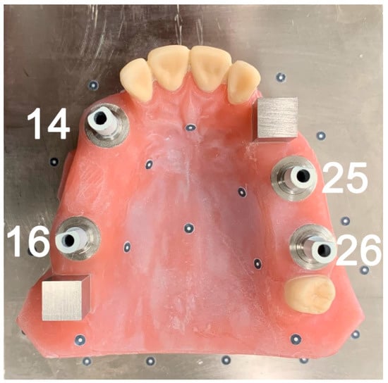 Four steel tubes for implant placement (positions 16, 14, 25, and 26 of the Federation Dentaire Internationale [FDI]) were inserted in the stainless steel base plate (10 × 10 cm) of the IMM, and Straumann RN Standard Plus implants (Straumann, Freiburg, Germany) were adhesively luted in the tubes (14 mm length, 4.8 mm diameter; Galvano AGC-Cem adhesive, Wieland-Dental, Würzburg, Germany). Two references cubes (RC, perpendicular to each other) were inserted in FDI positions 18 and 23. The basic structure of a partially edentulous upper was modelled of pink-colored methyl methacrylate (PalaXpress, Kulzer, Hanau, Germany; Figure 1).