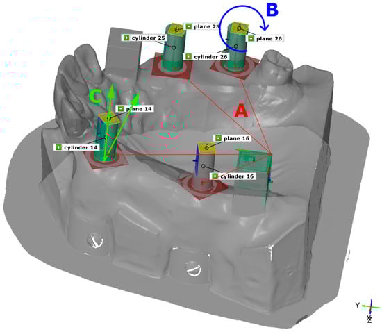 The received STL files were imported into Gom Inspect (Gom, Braunschweig, Germany) and aligned to the reference file with the RCs to measure the digital impressions. This made it possible to superimpose the respective coordinate systems within the digital impressions using the reference cuboids. To clearly determine the distances within the digital models, the distances between the reference cuboid and the implant–abutment interface points (IAIPs) were measured in the IMM. This procedure was applied to both the digital and the conventional models. Then, the absolute linear displacement (ΔR) of the IAIPs for each implant position from the digital and conventional impressions and the reference data set was calculated using ΔR = . To measure the deviations of rotation and angulation, planes and cylinders were constructed at the respective scan bodies. This made it possible to compare the same planes and cylinders in the master model and digital models. The corresponding distances and angles are shown in Figure 2.