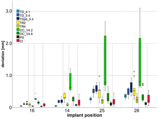 The results for the absolute 3D deviations and the rotational and angulation deviations for each implant position and the IOS are presented in Figure 3, Figure 4 and Figure 5, according to the International Organization for Standardization (ISO) 5725 guidelines []. The statistical tests for all the deviations are listed in Table 2.