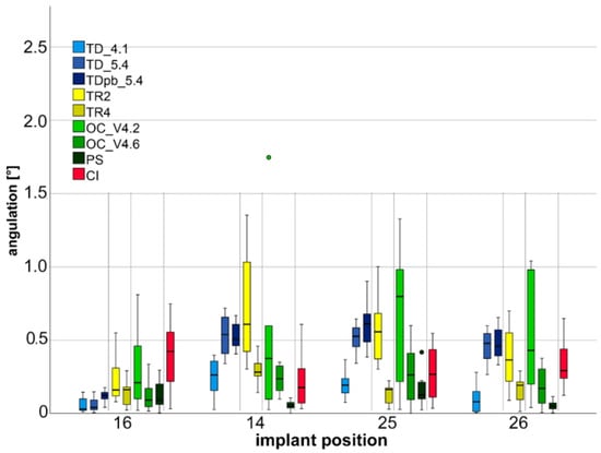Results for the angulation deviations for the implant positions for each intraoral scanner (TD_4.1: True Definition scanner (Cart version) 4.1; TD_5.4: True Definition scanner (Cart version) 5.4; TDpb_5.4: True Definition scanner (Portable version) 5.4; TR2: TRIOS II; TR 4: TRIOS 4; OC_4.2: CEREC Omnicam 4.2.1.61068; OC_4.6: CEREC Omnicam 4.6.1.152739; and PS: CEREC Primescan 5.1.0.190461).