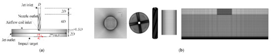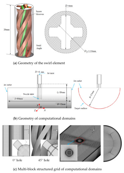 Figure 6b, becomes gradually weak, which decays more rapidly along the flow direction. At the periphery of the potential flow, the mixed airflow forms the “skirt type” green region with a larger diffusion area. For the MCIJ issuing from the 0° straight nozzle, the injected groove velocity is slightly lower than that at the central region of the nozzle due to the effect of the wall boundary layer, while it has a longer potential flow in the jet space and forms a “taper-foot-type” green region with a relatively smaller diffusion area compared with the SIJ. After the jet impacts the concave target, the rebound axial velocity from the wall free jet in the YOZ plane (