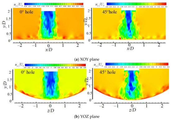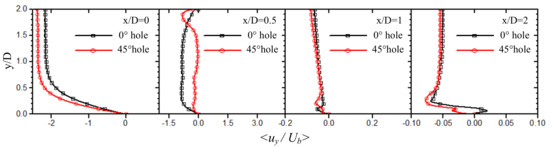 x/D = 0, the direction of the axial velocity of the jet coincides with the direction of the negative y-axis. Compared with the 0° straight hole, the obstruction of the rotation spiral groove of the 45° spiral hole makes the absolute value of time-averaged axial velocity in the center hole large. However, the length of the jet core with them is relatively close. In the region of the jet space at