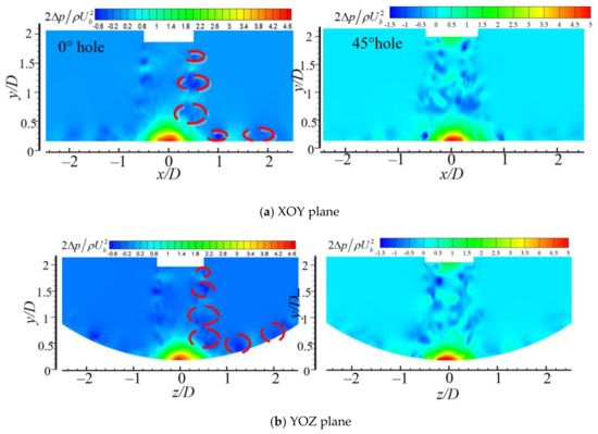Figure 7 shows the distribution of pressure in the XOY and YOZ planes. For the MCIJ, there are a series of blue regions with negative pressure (marked in red circle) around the potential flow, which are generated from Kelvin–Helmholtz instability in the shear layer, resulting in a series of vortex pairs. Under the entrainment effect of the airflow in the free shear layer, the jet in the stagnation zone deflects quickly, escapes outward in the radial direction, forms wall free jet at about