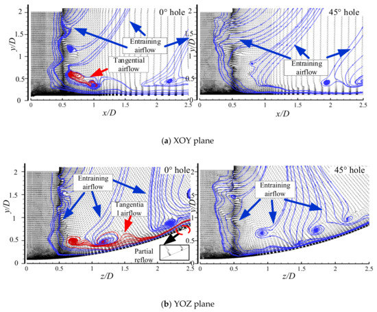Figure 8 shows the streamlines and velocity vectors in the XOY and YOZ planes. For the MCIJ, the surrounding airflow from the top of jet space is carried by the free shear layer, moving downstream to the target surface with some vortex pairs, and deflecting to the radial direction at