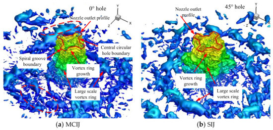 The flow in the free shear layer gradually forms lots of small-scale vortices, and some of these vortices develop, grow up, and come together, and at last the vortex rings form. The vortex ring may also continue growing and linking up into a large-scale vortex ring. For the MCIJ, small-scale vortex rings in the green region around the potential flow have a small diffusion area, and four large-scale blue vortex rings near the wall distribute in four directions, corresponding to the corners of four straight grooves. As the target is a semi-cylinder concave surface, the discharge capacity for the MCIJ is different. It can be seen that two of the four large-scale blue vortex rings are big, and the other two are small. Small-scale vortex rings are relatively sparse among these large vortex rings. For the SIJ, many moderate-scale vortex rings in the green region around the potential flow have a big diffusion area, and large-scale blue vortex rings near the wall evenly distribute and link into a circle. It can be inferred that the airflow near the wall escapes mainly along four corners for the MCIJ, while the airflow escapes evenly all around for the SIJ.