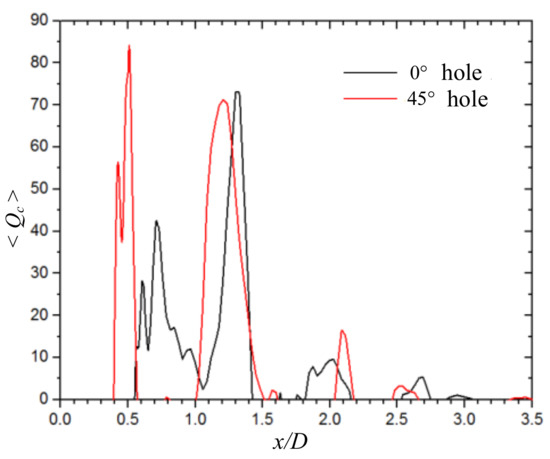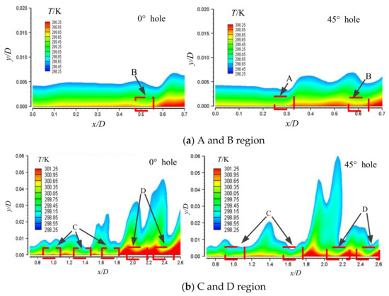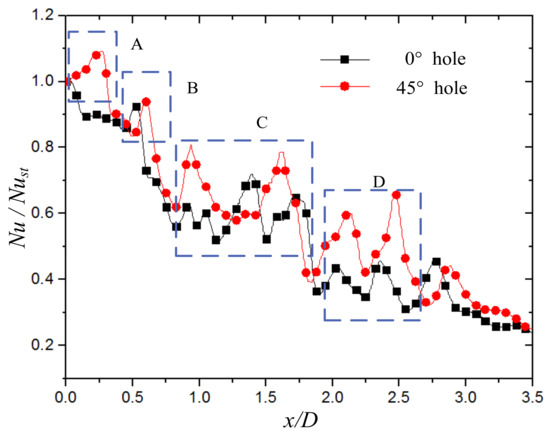 x/D = 1.75–2.6 of the D region, there are two peaks of approximately “sinusoidal” change with the 0° straight hole. Although there are two peaks with the 45° spiral hole, the corresponding