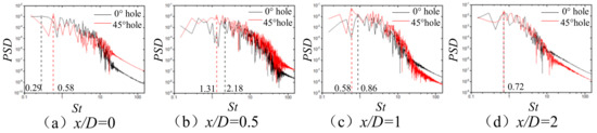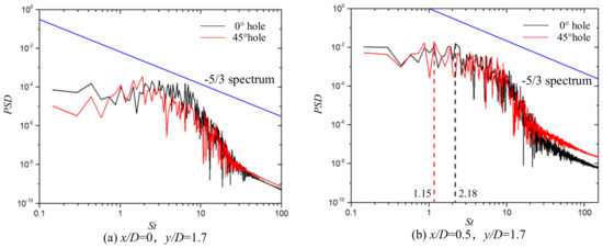Figure 18a, the temperature fluctuating degree of the 0° straight hole is larger than that of the 45° spiral hole, and the frequency characteristic values at the peak of the temperature fluctuation are consistent, and St is 0.29. At this position, the corresponding frequencies of the peaks of the radial fluctuating velocity are 0.29 and 0.58, and the frequency at the peak of the velocity fluctuation with the 0° straight hole is consistent with the frequency at the peak of the temperature fluctuation, but the frequency at the peak of the temperature fluctuation with the 45° spiral hole is behind the frequency at the peak of the velocity fluctuation. In