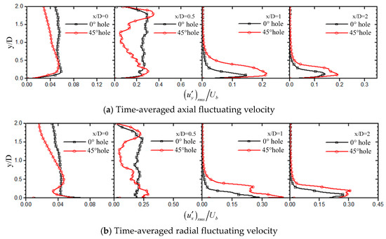Figure 14 shows the distribution of the root mean square of the fluctuating velocity in the axial and radial directions. There is less disturbance in the core area of the jet hole with a 0° straight hole, and the fluctuating velocity in the jet space basically maintains constant. The fluctuating velocity exhibits a complex change trend of increase–decrease–increase–decrease in the periphery region of the potential flow of