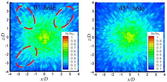 Nu ratio on the target surface with 0° and 45° flow guiding elements shows a random distribution due to the randomness of the jet impact, and the effective area of heat transfer is roughly equivalent. Heat transfer enhances at the four corners of the jet (dashed box in the figure) with the 0° straight hole. The 0° straight hole makes the velocity at the boundary of the channel smaller than that at the boundary of the central circular hole, and the velocity in the radial direction of the groove decays faster, resulting in a difference in heat transfer at the four corners of the target surface (red dotted frame dashed box in the figure).