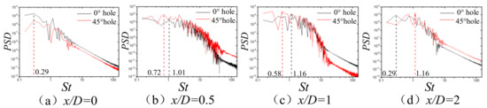 x/D = 0.5; that is, the power spectrum peak of the radial fluctuating velocity has a smaller frequency. For the jet of the 0 ° straight hole, airflow near the wall at