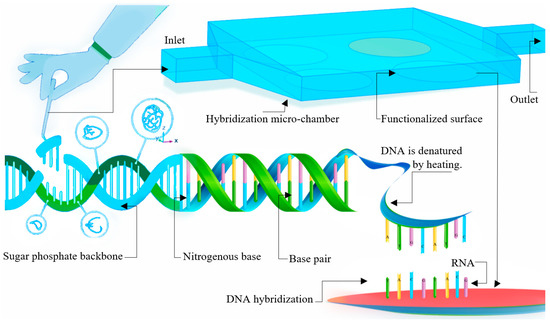 Although there has been a significant improvement in current biosensors, the design and fabrication are still challenging and time-consuming. These challenges are bolder in bio-receptors and assay matrix design, achieving specific binding and detecting low concentration target molecules within a low-volume sample [12,13,14,15,16]. Scientists have been using various active and passive methods to improve biosensors’ sensing and fabrication to resolve these challenges. In passive methods, sensing is enhanced with new materials and geometry optimization, while in active methods, moving parts and external forces such as electric or pressure field are applied. Some solution in this matter include utilizing conducting polymers for high-performance biosensors due to their chemical versatility and charge transport [17,18], use of metamaterials in resonators for better and durable biosensors [19,20], microelectrode array approach for high sensitivity and live detection [21,22], and microfluidic approach for DNA analysis [23,24,25]. In the current study, to enhance the performance of microfluidic-integrated biosensors, three different types of functional designs, with both active (E cases) and passive (H cases) methods, are presented. It is shown that these designs would improve the efficiency (in sensing and time of detection) by 6–62%, while they would not have a considerable effect on the fabrication and costs. Additional advantages of these designs are simplicity and application to different channels. Finally, for validation and further studies, these methods are applied on an experimental setup of DNA hybridization. Figure 1 illustrates the bio-recognition process for DNA hybridization.