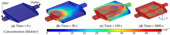Concentration contour for the original case (A-01) at the start of the time (a), after 50 s (b), after 150 s (c), and at the end of 50 min (d).