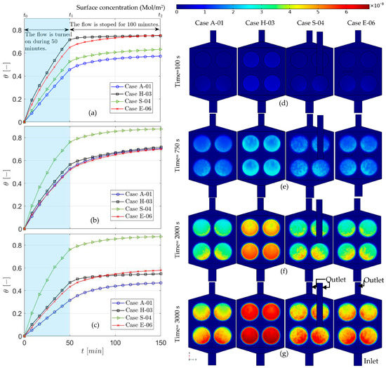The time-dependent solution for surface coverage of the original experimental setup (Case A) in comparison to cases H-03, S-04, and E06 for the whole surface (a), (b) and (c). A slide of surface concentration contour on the functionalized surfaces for cases A-01, H-03, S-04, and E06, after 100 (d), 750 (e), 2000 (f) and 3000 (g).