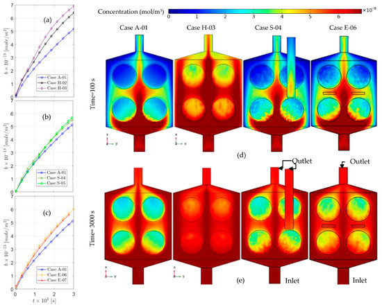 The time-dependent solution for surface concentration in the first 50 for the original experimental setup (Case A) in comparison to the: thin chamber (a), suction (b), and electroosmotic flow (c). A slide of bulk concentration on the functionalized surfaces for cases A-01, H-03, S-04, and E06, after 100 (d) and 3000 (e).