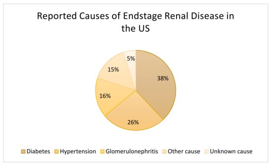 ESRD is a pressing issue, in 2018, in the US alone, the number of patients with ESRD was 131,636, a 2.3% increase compared to the previous year. ESRD prevalence in 2018 was 783,925, with 70.7% receiving dialysis and 29.3% of patients having a functioning transplanted kidney [15]. The leading causes for CKD and ESRD are diabetes, hypertension, and cardiovascular disease (Figure 1). Controlling the underlying conditions, can slow the progression of CKD and help to prevent ESRD.