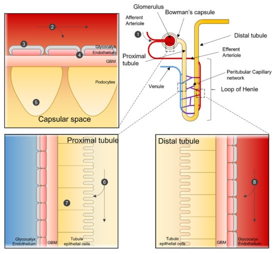 From the lumen of the capillary to the inside of the Bowman’s capsule, the glomerulus contains four structures that act as filters: the glycocalyx, the endothelium, the glomerular basement membrane (GBM), and the podocytes. The glycocalyx is a negatively charged layer of glycoproteins and glycolipids that protects the underlying endothelial cells and prevents large protein leakage. The endothelial layer is a fenestrated endothelium with large pores of 70–90 nm in diameter. The endothelial cells repose on the negatively charged GBM with pores of 2–8 nm. Its role is to prevent the filtration of large proteins and cellular components from the blood. The last filtration barrier is composed of the podocytes that sit on the urine side of the GBM. Organized as a monolayer, their interdigitating foot processes form the filtration slit sized 4 to 11 nm. Overall, the four layers create a charge- and size-selective filtration barrier with a glomerular functional barrier’s (GFB) pore size of 4.5–5 nm [17].