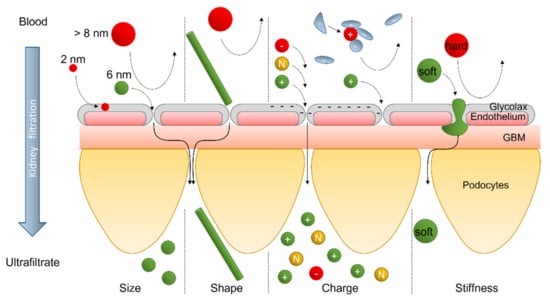 Nanoparticle’s filtration in the glomerulus in function of NP’s size, shape, charge, and stiffness.