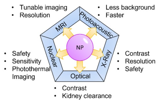 Several NP-based methods have recently emerged to improve optical imaging contrast, including near-infrared fluorescence, chemiluminescence, and photoacoustic.