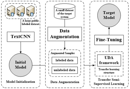 Third, Figure 1 gives the architecture of DeepPTSD, which consists of three major steps, i.e., model initialization, data augmentation, and transfer semi-supervised learning. First, the model initialization step trains the initial model, with DPU as training data and parameters being randomly initialized. Here, we treat malicious HTTP traffic detection as a special text classification problem and utilize TextCNN as the underlying deep neural network (detailed in Section 3.2). Second, the data augmentation step enhances the dataset of the target system by generating a diverse set of samples from . Here, we propose a HTTP payload data augmentation method based on a keyword avoidance perturbation mechanism for this task (detailed in Section 3.3). Third, the transfer semi-supervised learning step adapts the initial model to the target system by fine-tuning it on the augmented dataset of . In this paper, we use the same deep neural network (i.e., TextCNN) for both the initial model and the model of the target system (i.e., target model). Here, we design a learning framework by integrating a semi-supervised learning framework (i.e., the UDA framework detailed in Section 3.4) into a transfer learning structure, to leverage the augmented samples.