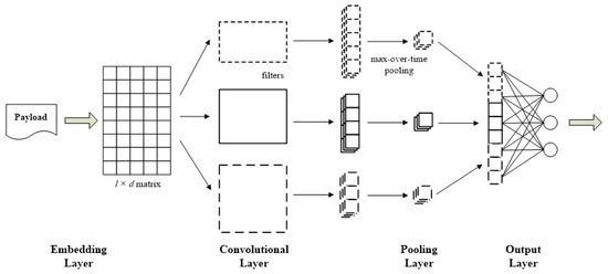 - CNN: It trained the detection model based on the TextCNN model [14]. Here, a HTTP traffic sample was segmented based on the approach proposed in Section 3.2.