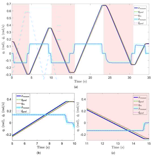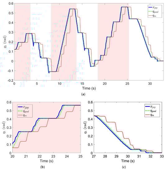 (a) First axis displacement while using the improved Motoman ROS node for teleoperation (b) Zoom on phase 2 (c) Zoom on phase 3.