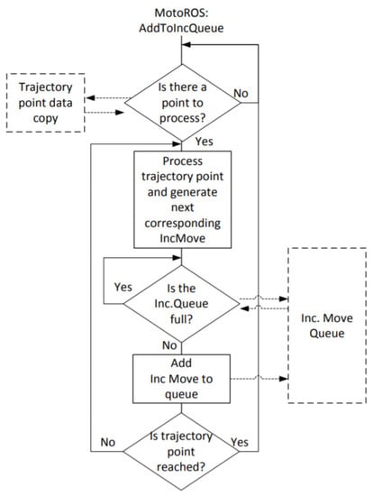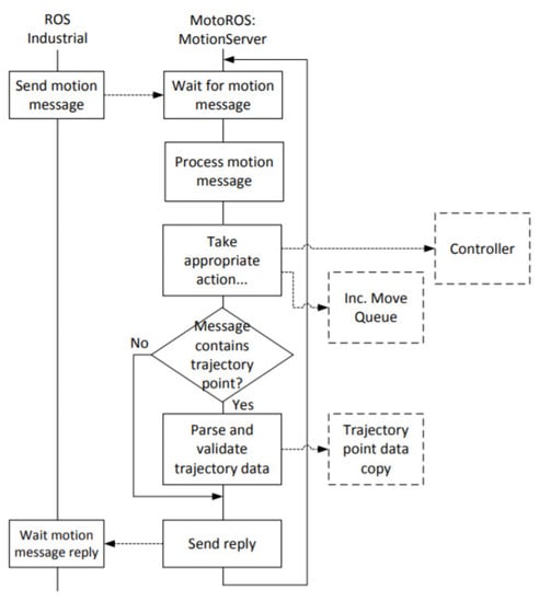 Figure 3 presents the Motoman ROS node architecture provided by Yaskawa Motoman documentation [35]. This node is based on the principle of two-point trajectories. Each trajectory is discretized by the Motoman ROS node and then sent to the robot controller. The MotoRos code then takes care of applying this interpolation between the different trajectory waypoints.