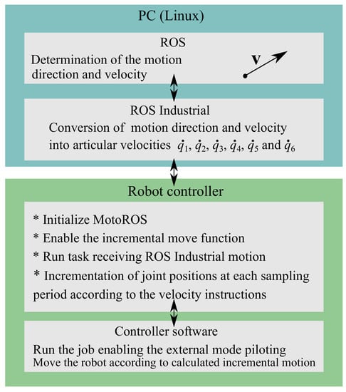As one can see, the standard Motoman node architecture is not suitable for teleoperation. To obtain an adequate operating mode, it is necessary to make modifications on the control method. This work is concerned with a method that can improve the performance of ROS-based robot control system. This method consists of the replacement of position control by velocity control. Therefore, the Motoman ROS node will be based on the kinematic model presented by Equation (6). Here, the motion direction and velocity are first determined and then converted into articular velocities. The improved system architecture becomes as mentioned in Figure 6.